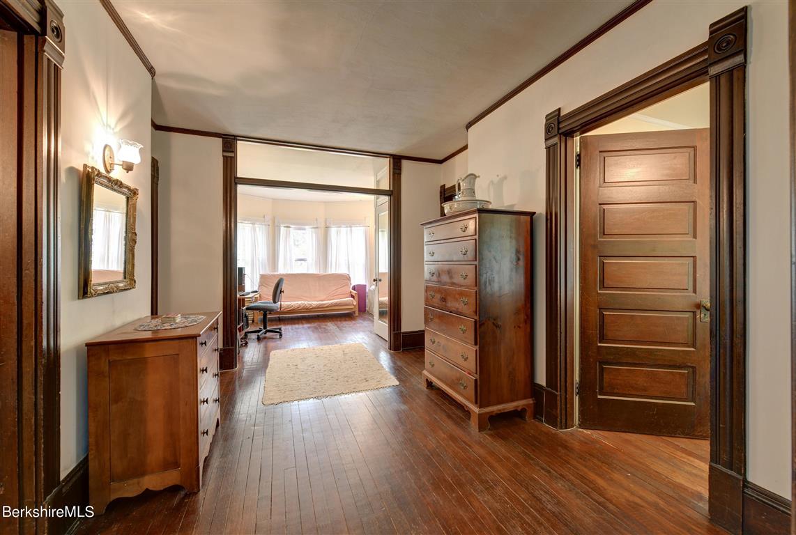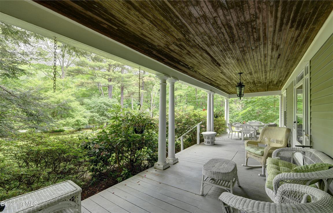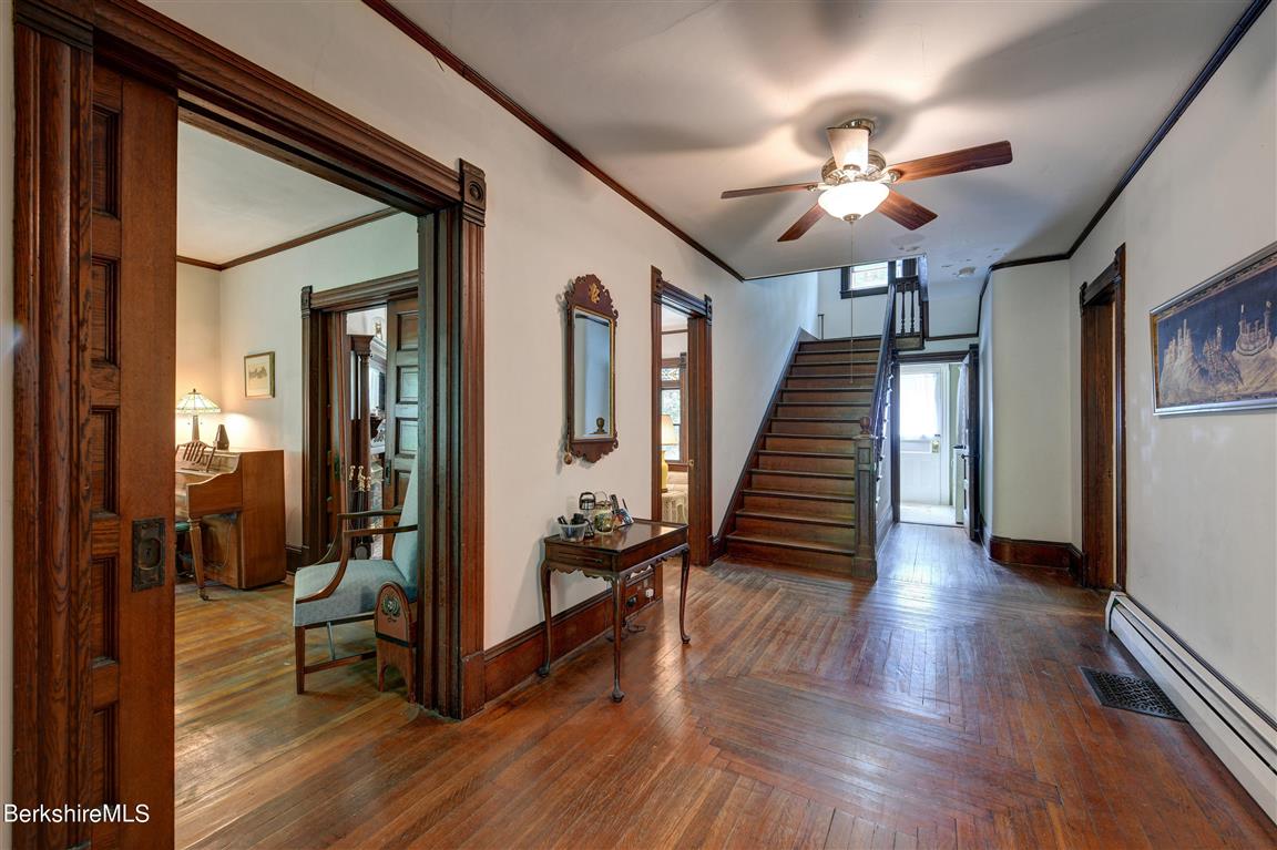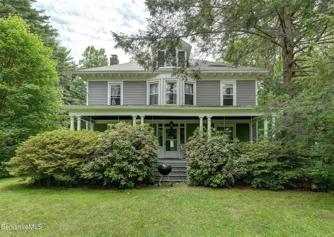 The rocking chair front and back porch give a taste of the 1900 Colonial's character inside. Located in Great Barrington, it offers oversized rooms with original woodwork and pocket doors. There are five bedrooms and two bathrooms, high ceilings, and a backyard set back from the road. The kitchen and bathrooms are in need of updates. Listed at $625,000 by Housatonic Real Estate.