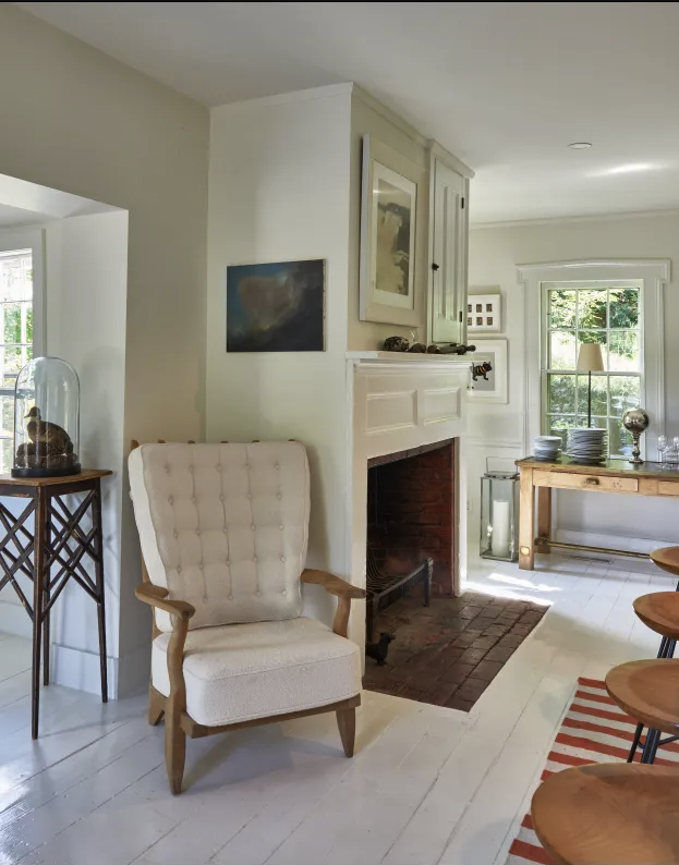 Their current home, dating to 1792, embraces both history and reinvention: original rooms remain intact while new additions are unapologetically contemporary. A mudroom opens into a dining space with sliding doors onto the water, a screened porch became a glass-walled living room with a woodstove, and an old front parlor now serves as the primary suite. Antique finds from Hudson mix with custom interventions, but the real star is the view: water, light, and trees reflected off painted-white floors. For Booth and Davis, design is less about showpieces than about the daily pleasures of being in—and on—the water.