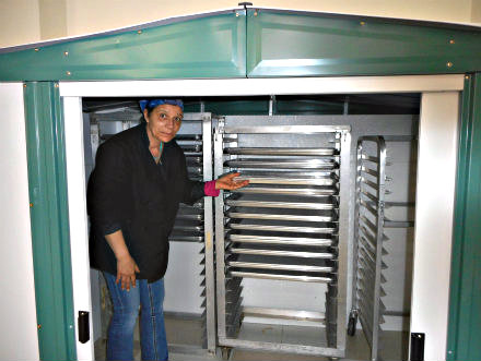 Mariana Bergtold in the tempeh shed, where the kitchen manufactures 100 pounds of chickpea tempeh at a time.