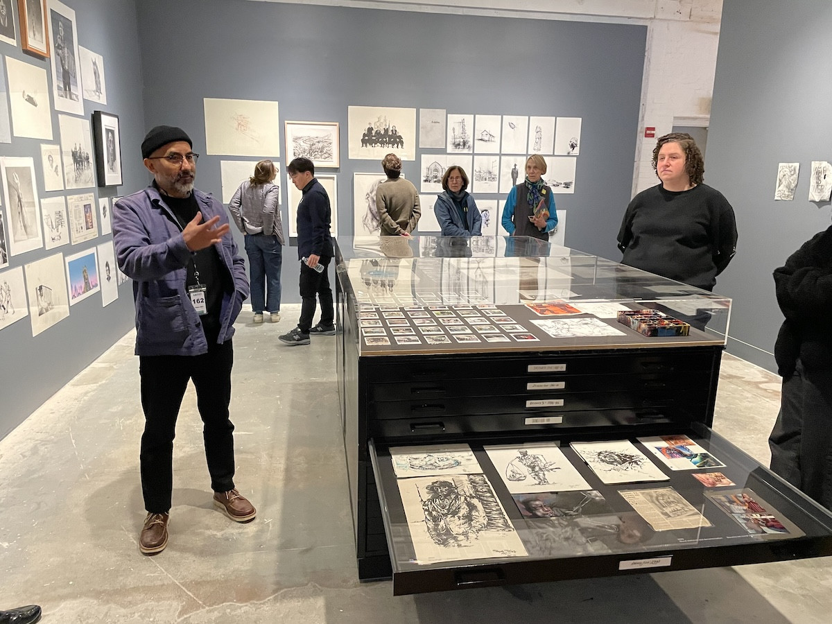 Artist Vincent Valdez Discusses his early work, displayed in flat files in the gallery. Also pictured; Denise Markonish, co-curator.