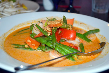 Yaya, the dining manager, says the dish is very old school. "The younger generation of Thai cooks don’t even know how to make that. We try to serve Thai food like my grandmother would make.” We did not try any of the eight salads on the menu but the Green Papaya ($8.95), mango salad ($9.95) and Yum Nua with grilled beef ($8.95), looked delicious when served to our neighbors. They say we eat with our eyes first and this is definitely true at Vong’s. Entrees are presented beautifully but without pretense. I ordered my favorite, the Panang Curry with shrimp ($13.95). The contrast of vibrant red and green peppers, verdant string beans, and bright carrots against the white plate was striking as the vegetables and shrimp floated in the fiery curry sauce. The somewhat soupy consistency of the dish is what I loved most. It’s served with a spoon so you can properly savor the aromatic broth. Kim, who had never tried the pho before, ordered their signature dish, the Dac Biet Xe Lua ($13.95). Steak, beef, meatball, brisket, flank, tendon, shrimp and rice noodles floated in a huge bowl of rich, savory broth. The staff seemed very amenable to making any adjustments to our order and didn’t bat an eye when she asked them to hold the tripe.