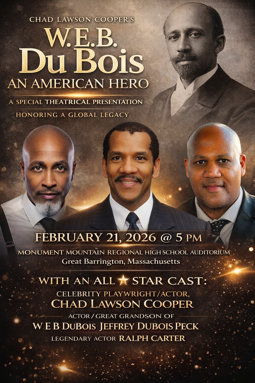 Co-presented by the Schumacher Center for a New Economics, Multicultural BRIDGE, BerkShares Inc., the Freedom Center, and the NAACP Berkshire County Branch, the production is written and produced by New York–based playwright and actor Chad Lawson Cooper. The title role is performed by Du Bois’s great-grandson Jeffrey Du Bois Peck, bringing a generational dimension to a work that traces Du Bois’s journey from Great Barrington to the global stage. Veteran actor Ralph Carter joins the cast as well.