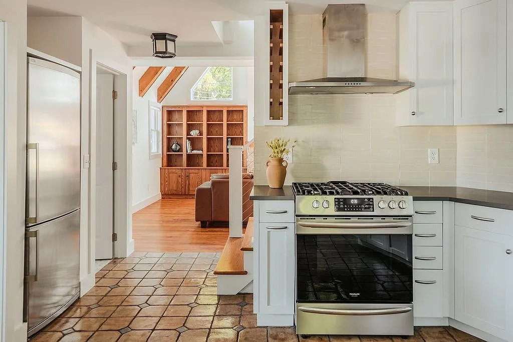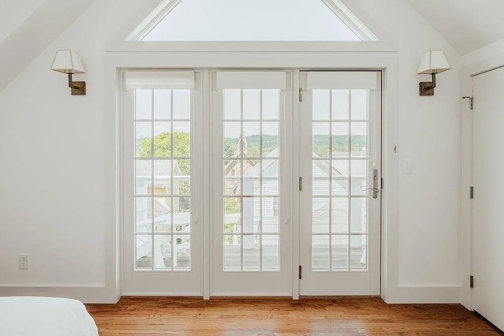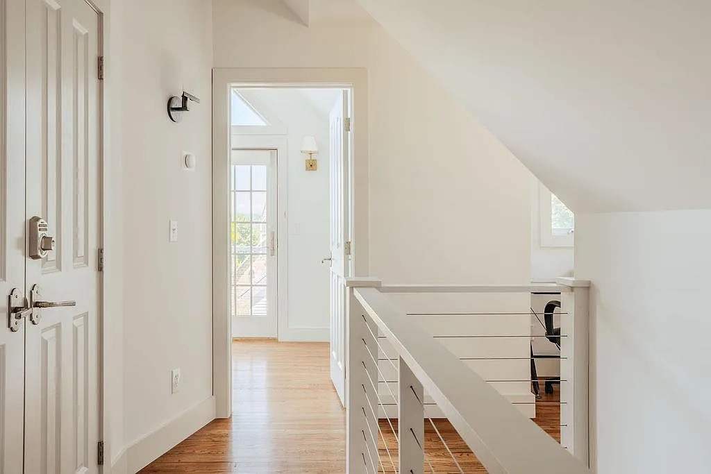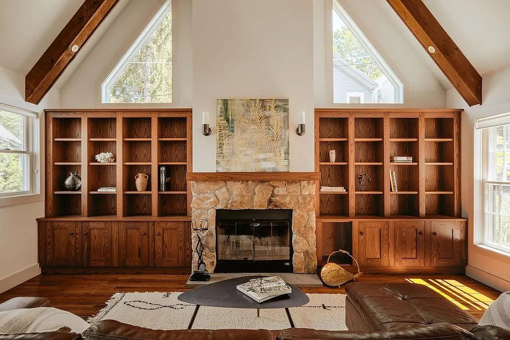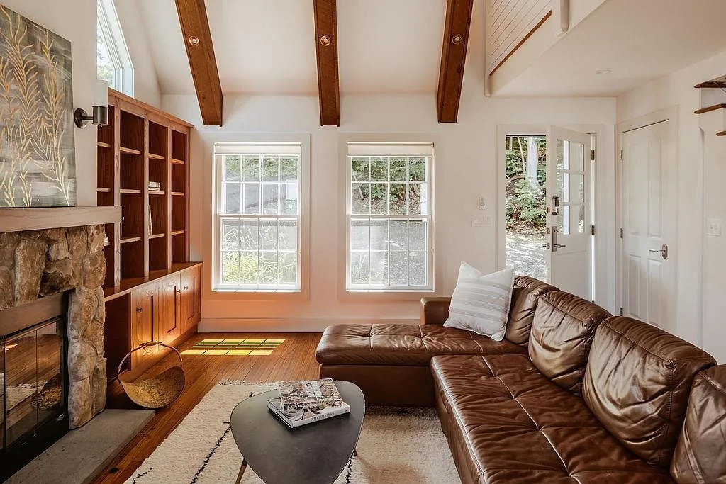 It’s two bedrooms and two bathrooms across 1,044 square feet, set on a compact 3,485-square-foot lot. The house has vaulted ceilings, exposed beams, a cozy fireplace, and updated fixtures throughout. The main level includes a bedroom and full bath, and the primary suite upstairs has a balcony with river views.