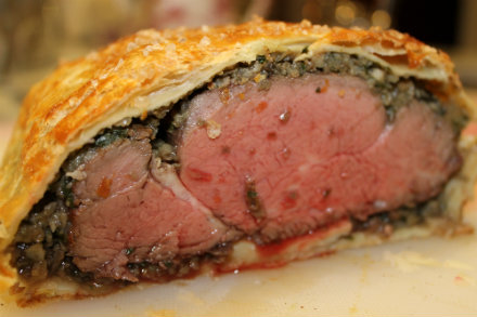 Whenever there was a special occasion in our house or a spectacular party in the works, my mother would pull out all the stops and make a classic dish or dessert that was a Herculean effort from my young point of view. Two dishes stand out in particular: Beef Wellington and Baked Alaska. I never understood the attraction of the latter. Cake is cake and ice cream is ice cream. Should the two collide, it needn’t occur under the veil of a meringue bomb with the added jeopardy of a brief appearance under a broiler. She loved making it until one year, with her hands full, she used a bare foot to push the scorching rack bearing the Alaska back into the oven, and the dessert was forever removed from our festivities. The Beef Wellington lived on, and it is with much chagrin that I admit to never undertaking the sumptuous and elegant main course until a client (whom I could not refuse) requested it upon his return home from a long stay in the hospital. I smiled at memories of my mother making her own pastry and just enough extra to cut out flowers and leaves to decorate the crust. She was talented in that way, which I am not. I promised to make the Wellington, but since this was new territory for me, I didn’t promise it would be crowned with a pastry laurel wreath.
