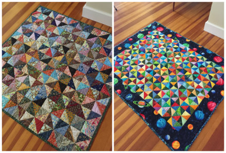 Everywhere he’s ever worked — The Jim Henson Company, Sesame Street, Chelsea Editions (a high-end textile manufacturer), Rotondaro collected tiny bits of fabric that were headed for the scrap heap. He also had inherited his mother’s collection of cotton fabrics. All of that collecting accounts for the astonishing play of patterns in his quilts, whether designed in traditional Amish patterns or his own free play of colors and prints. Some of the scraps get used right away; others, like those in one of his hexagon quilts, took years to accumulate.