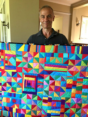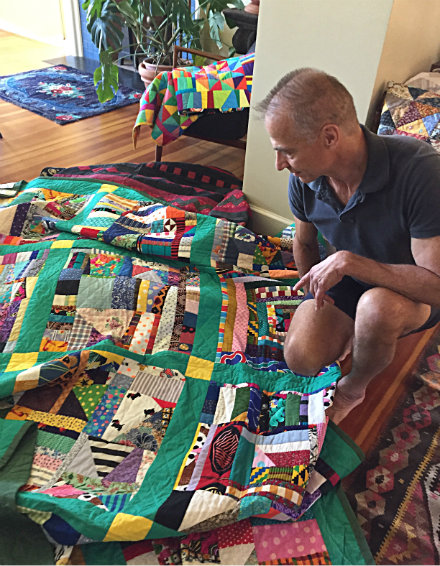 By Lisa Green If you look closely — and it helps if you are well versed in the wardrobe of Sesame Street characters — you might find pieces of Miss Piggy’s elegant cocktail dresses in the patchwork of Stephen Rotondaro’s quilts. Rotondaro, who was a costume designer with The Muppets for 25 years, likes to say he sewed his way to seven Emmys. And now he has sewn his way to his own quilt show at Brookside Quiltworks in Egremont, Mass. The show, which will feature around 50 quilts made over the course of 30 years, opens on Sunday, Oct. 8 and will run through Dec. 21. So how did an award-winning costume designer, adept at creating a spider costume for The Muppet Christmas movie or — perhaps his most bizarre assignment — a smoking jacket for a brick (yes, a brick), come to embrace the art of quilting? “My mother died at age 54, and left quilt tops,” says Rotondaro, who by osmosis picked up the sewing gene (he also has a graduate degree in costume design from NYU). “To honor her I finished her work. Then I worked with a quilter at The Muppets. She had a calendar of Amish quilts that inspired my first one.”