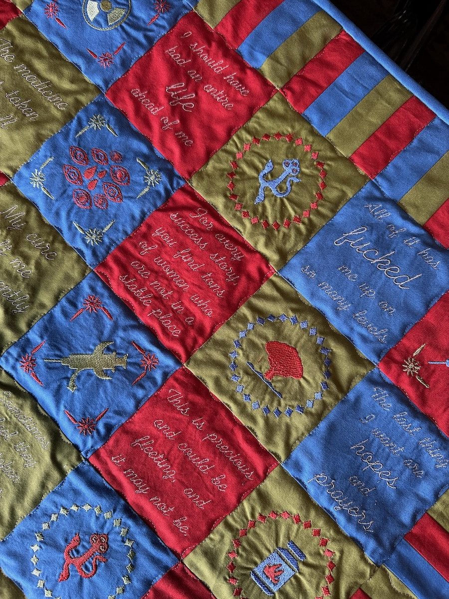 Olsen's quilts look comforting but explore the impact of living with cancer as a young person.