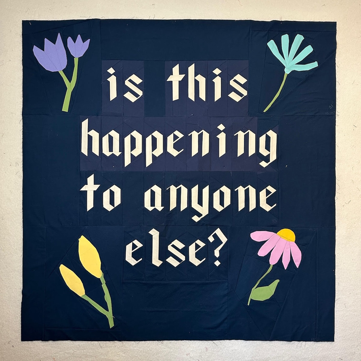 Olsen, who was diagnosed with Stage 4 metastatic breast cancer in her 30s, has transformed her personal journey and the narratives of others into works. “Witness,” for which the show is named, includes embroidered quotes from survivor interviews in the style of a temperance banner or Victorian-era community quilt. “Treatment” is an embroidered wholecloth quilt that shows a chronological list of all the drugs Olsen has had to take during her cancer experience. “Ribbon” deconstructs the metastatic breast cancer ribbon’s colors (pink, teal, and green); “Verification” is a quilted floral greeting card based on the world of the online cancer community that asks, “is this happening to anyone else?”