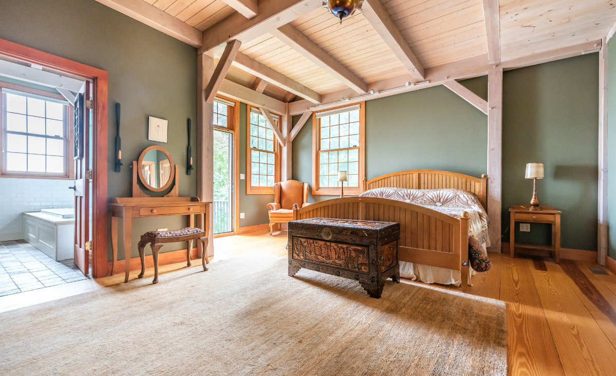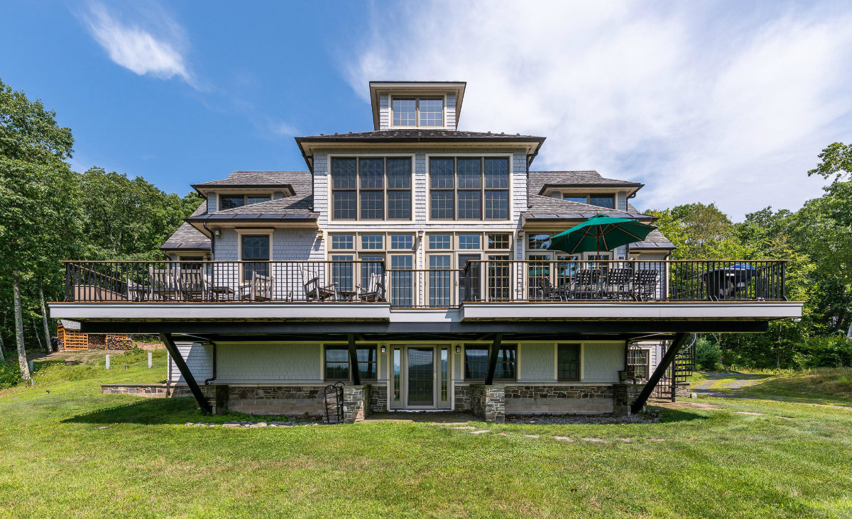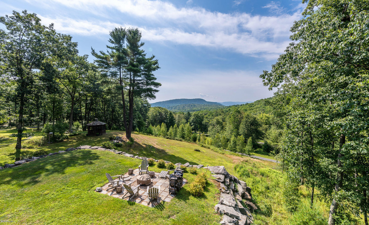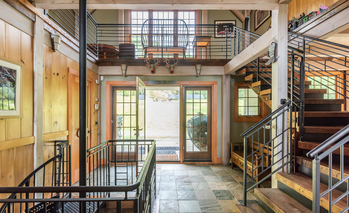 This post and beam Contemporary on 20 acres in Austerlitz has a wall of glass taking in the far-reaching southern view. There are five bedrooms and five bathrooms, an open kitchen/living room with a fireplace, and a first-floor master suite with attached office. There’s a second fireplace in the large lower-level family/game room. Outside is a deck and fire pit. The house is equipped with solar panels. Listed for $1,890,000 by Stone House Properties.