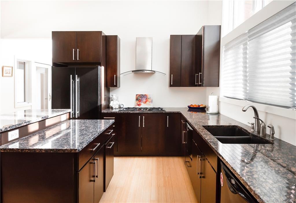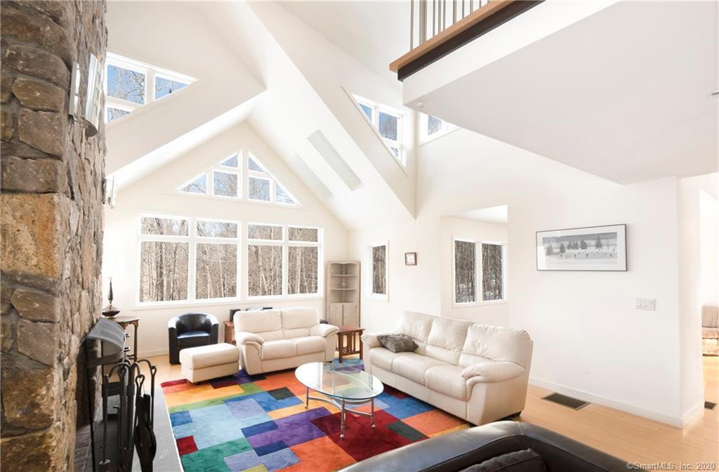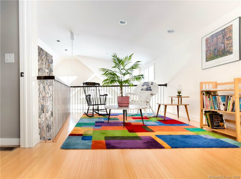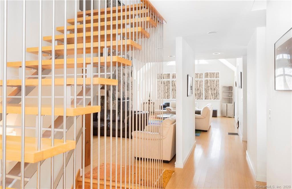 Noted architect David Varnish designed a Contemporary that takes advantage of its private setting in Morris. There are three bedrooms and two-and-a-half baths, and a two-car attached garage. Built in 2006, the house has over 2500 square feet, a large stone fireplace (matching the stone on the exterior), main-floor laundry, a deck, central air, and has state-of-the-art technology. There are bamboo floors throughout. Listed at $1,520,000 by Klemm Real Estate.