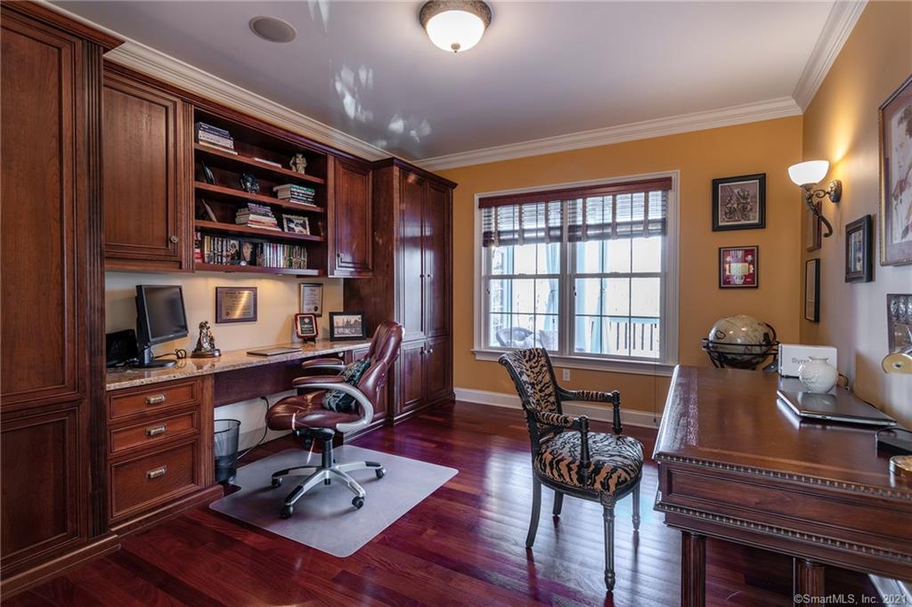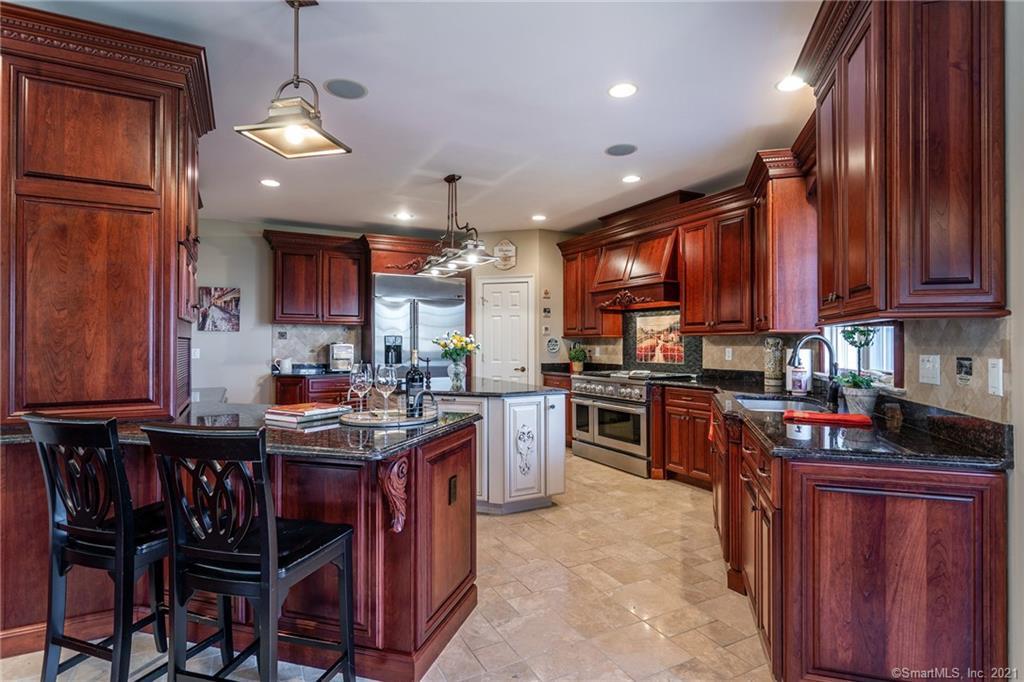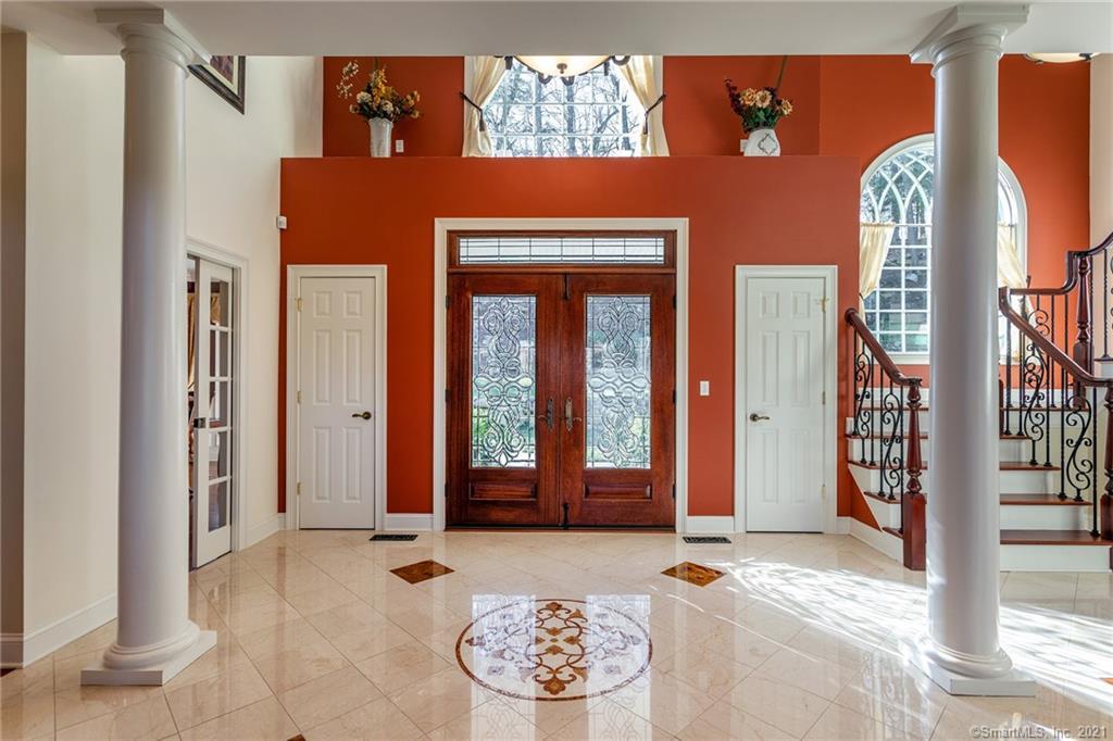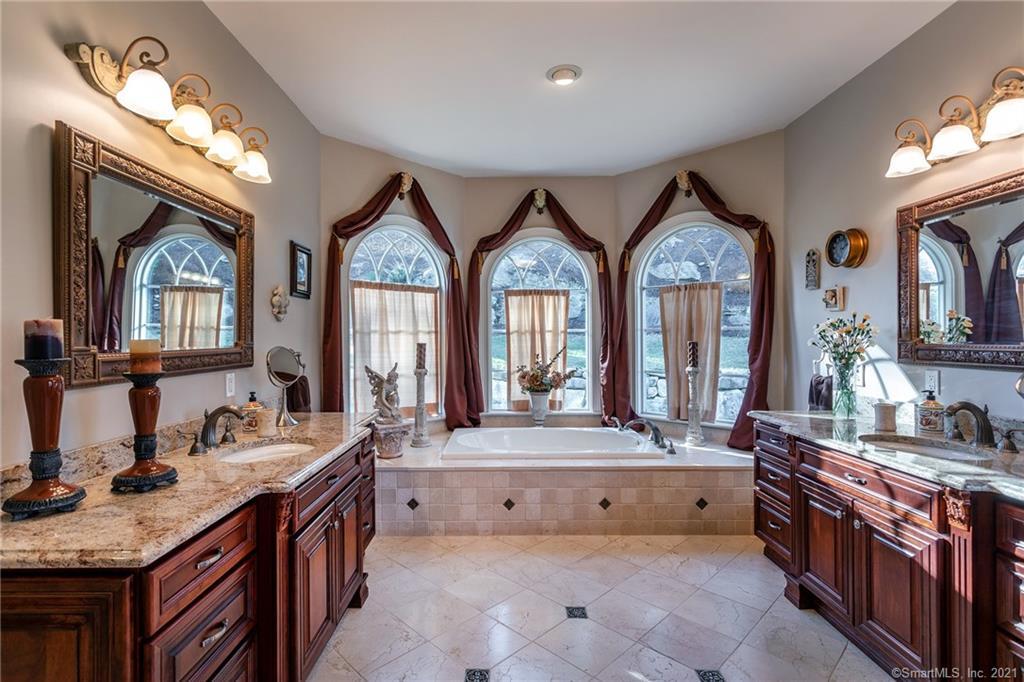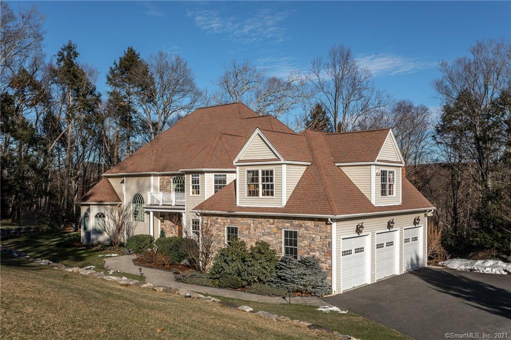 The agent calls this New Milford Colonial "majestic," and that it is, with over 5,000 square feet, four bedroooms, five pathrooms. A grand, inlay marble foyer leads to a two-story great room. There is a chef's kitchen, mahogany floors, a private offer and master suite with luxurious marble bath. Multi-tiered balconies allow views of the private yard. There is the ability to site a pool in multiple areas. Listed at $1,295,000 by Coldwell Banker Realty.