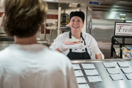 By Sharon Smullen According to Allison Orr, dance and dancers can take many forms. As artistic director of Forklift Danceworks, she finds her inspiration in the most unlikely places. Take the world of institutional food service. Day and night, these often invisible workers move through dining halls and kitchens catering to the needs of hungry hordes. At Williams College in Williamstown, Mass., their lives revolve around feeding wholesome food to students oblivious of their efforts. Next weekend in Paresky Center, Forklift Danceworks presents "Served," propelling the kitchen workers into the spotlight by transforming everyday occupational activities into dynamic dance routines. Instead of burgers and honeybuns, a new menu of moves includes a mop-wielding trio (Gene Kelly fans take note) and some sharp synchronized knife skills. Dinner service will never be the same. The program begins with small group tours of dining facilities — kitchen prep, bake shop, stockroom — to see staff at work. A 30-minute performance by some 50 employees follows in the Great Hall, viewed from balconies overlooking the large open space. The event ends with a banquet prepared as part of the dance. Composer Graham Reynolds replaces dining hall clatter and chatter with an original score performed by a nine-piece student jazz ensemble joined by guest luminaries digital violinist Todd Reynolds, bassist Avery Sharpe and drummer alum Jason Lucas. The production is enhanced by Stephen Pruitt’s lighting and set design.